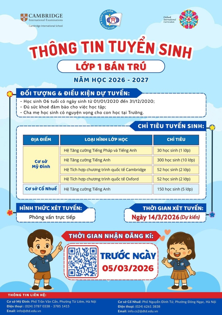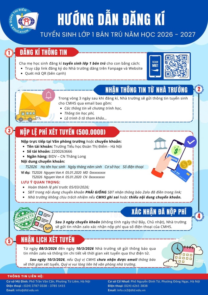 Trường Tiểu học Đoàn Thị Điểm Hà Nội trân trọng kính gửi tới Quý Cha mẹ học sinh thông tin đăng ký tuyển sinh lớp 1 năm học 2026 – 2027: